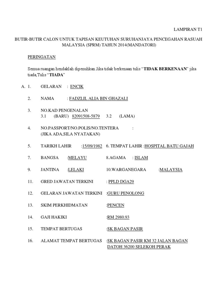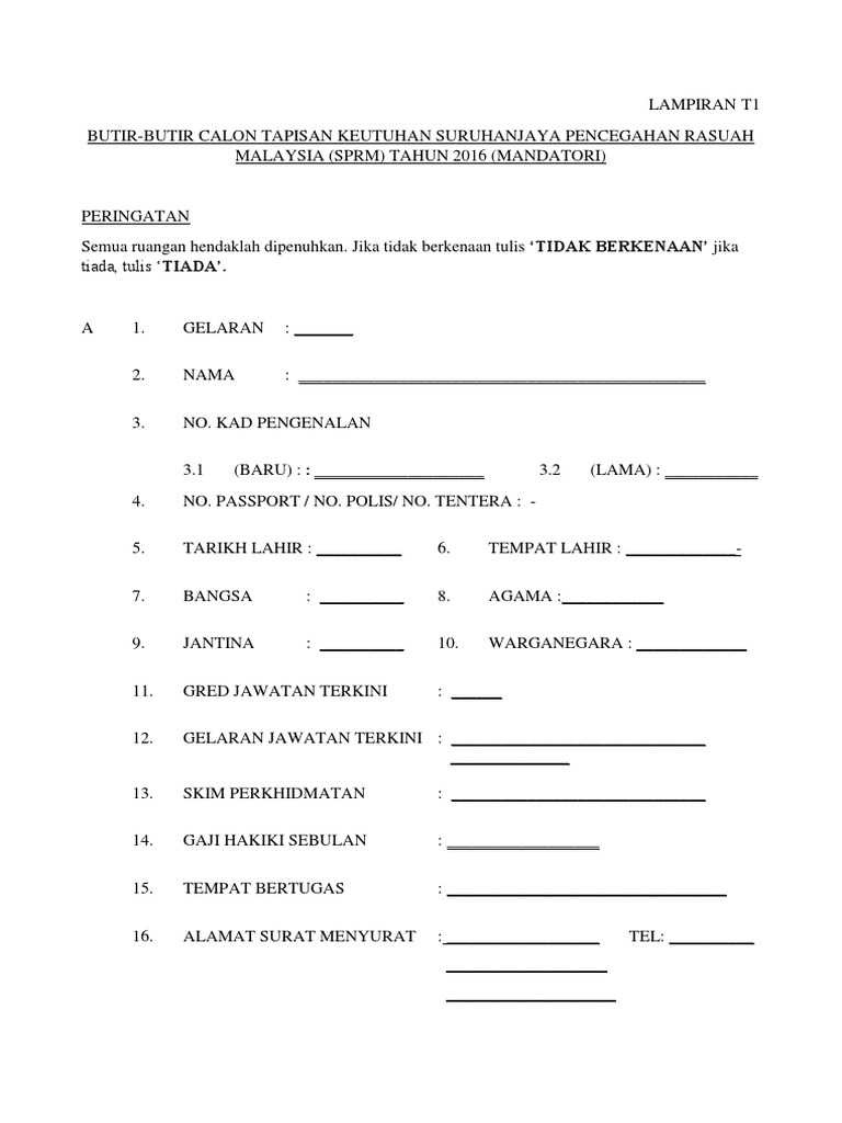 Sehubungan itu juga, kerjasama pihak ybrs. Panduan isi maklumat peribadi tapisan keutuhan sprm untuk epangkat tetamu istimewa. Borang lampiran tl dan surat tapisan keutuhan daripada sprm salinan lnpt bagi 3 tahun terkini 2014 2015 2016 keputusan tapisan keselamatan evetting daripada pejabat kpkk sila v dalam kotak berkenaan saya mengesahkan semua dokumen di atas telah lengkap dan dilampirkan bersama sama permohonan ini. Lampiran t1 butir butir calon untuk tapisan keutuhan suruhanjaya pencegahan rasuah malaysia sprm tahun 2014 mandatori peringatan. Estk diwujudkan untuk memudahkan dan mempercepatkan.