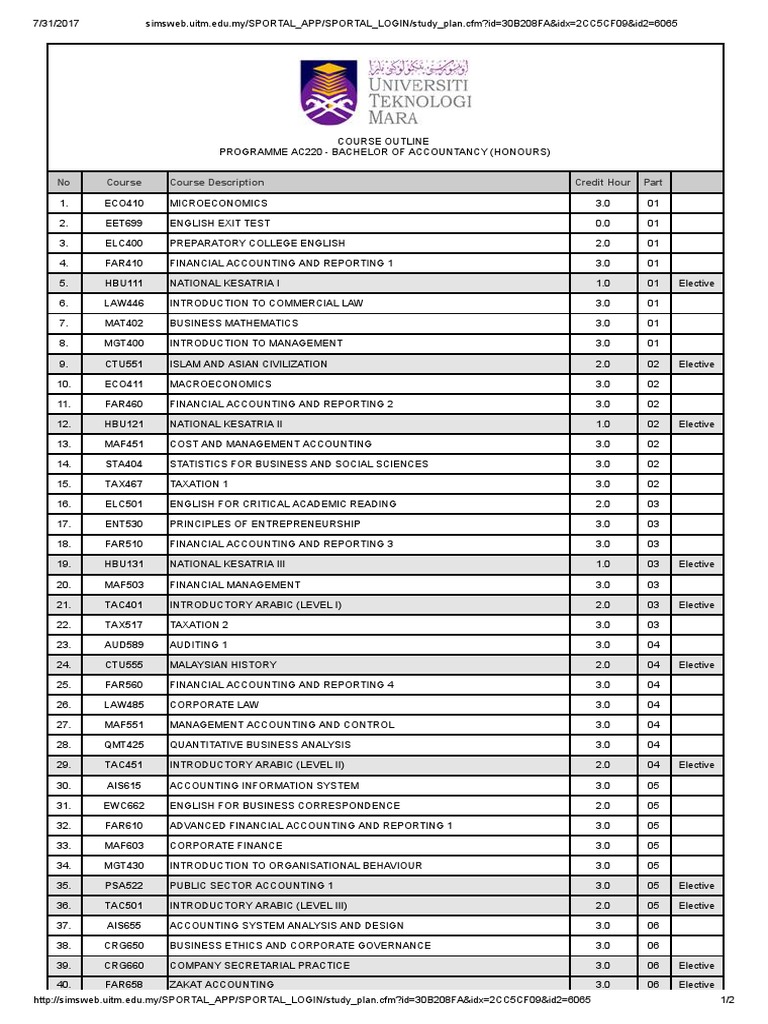 Diploma in accountancy (ac110) has 2 and a half years of period. Develop the practices for developing worksheet accounts & the principles of accounting. The duration of this programme is 4 years (8 semesters) for graduates from stpm/matriculation or any equivalent qualification. Universiti teknologi mara (uitm) add to educart. Apr 09, 2016 · tapi, aisyah still nak promote. The diploma in accountancy (dia) programme has been designed with the objective of training bumiputera in the field of accountancy at a sub professional level. The dia programme has been designed with the objective of training bumiputera in the filed of accountancy at a sub professional level. Alison.com has been visited by 100k+ users in the past month Please visit the respective website for more information. Thank you for using studymalaysia's course enquiry system. The duration of the course is 2½ years. The dais programme has been designed with the objective of training bumiputera in the filed of accountancy and information system at a sub professional level. There are a total of 5 semesters.